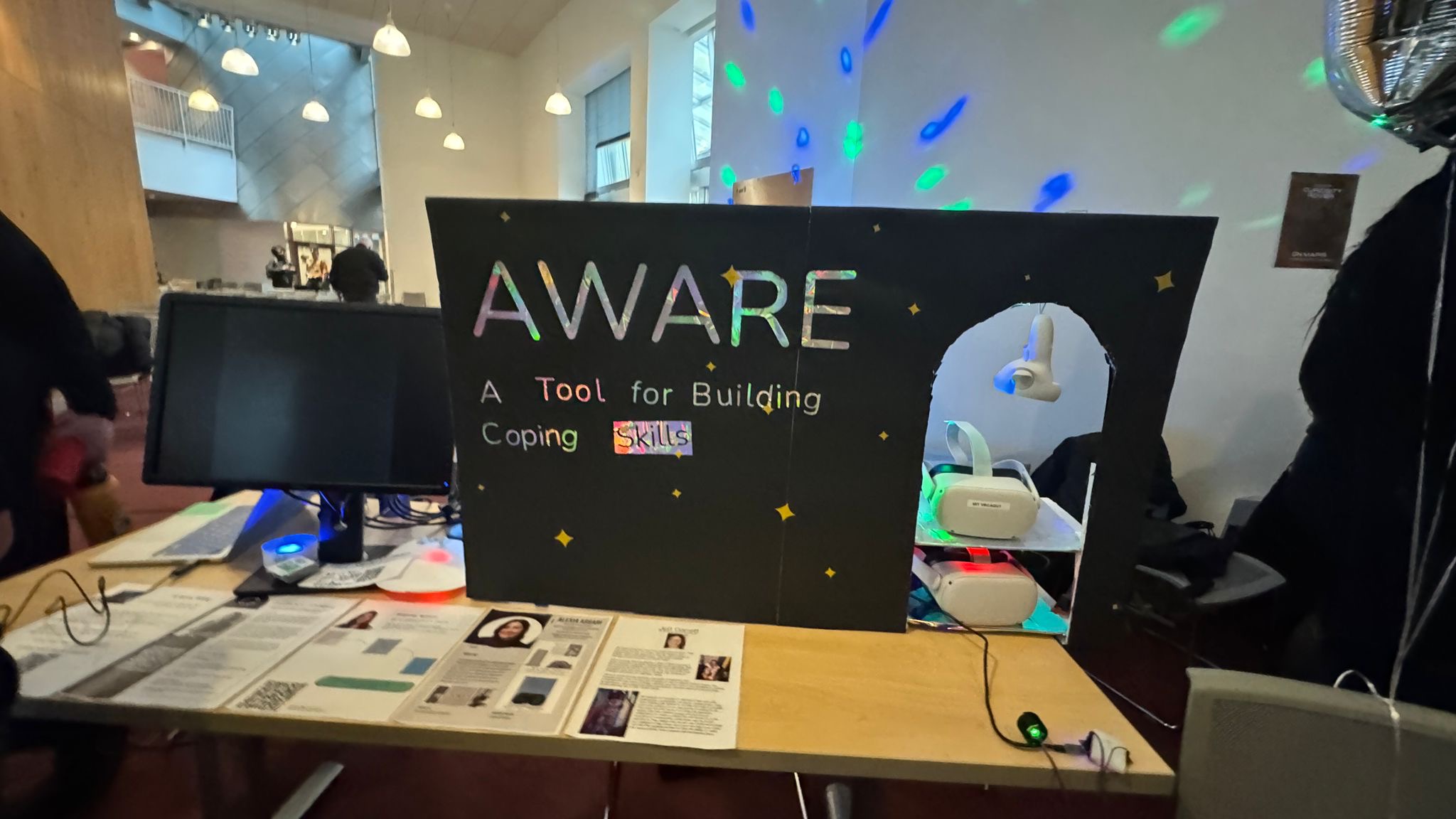 In AWARE, is a VR experience to help users de-escalate from strong emotions with box breathing. In this project, I linked a heart-rate monitor to the Quest headset through bluetooth so the experience can respond to the user’s biometric feedback.