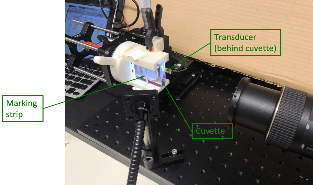 Close-up of the cuvette, transducer, and mount in a later version of my setup. I have made the marking strip more robust and added a camera rail to allow more fine adjustments of the camera position. Clamps have been replaced with zip ties to hold the transducer more securely.