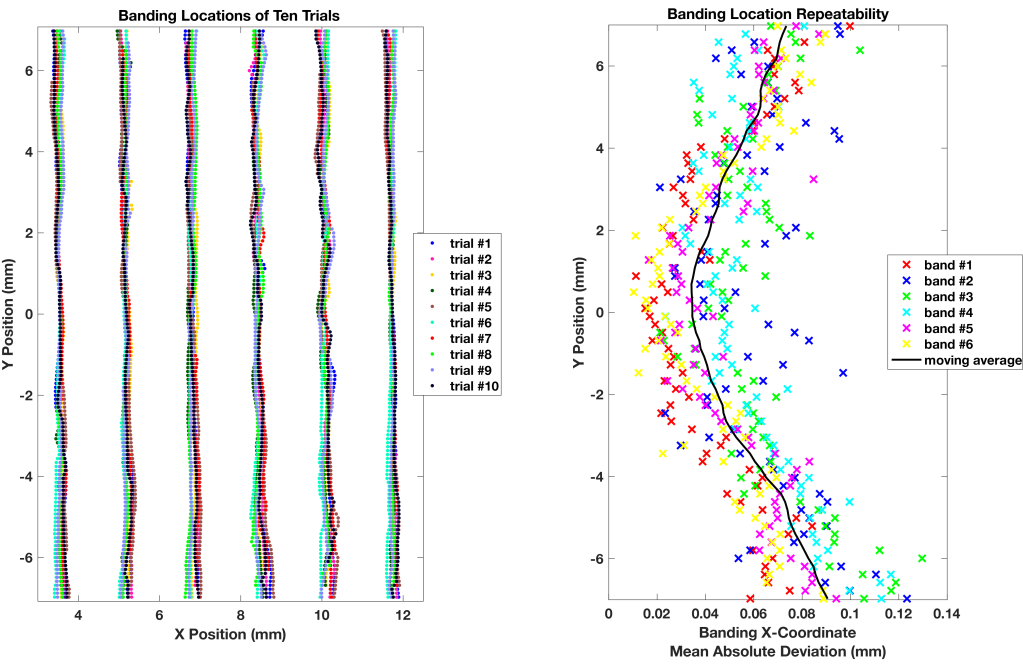 The pattern geometries made using acoustophoresis are repeatable. Repeatability at the center of the cuvette is better than at the top and bottom, likely due to acoustic streaming that disrupt the pattern.